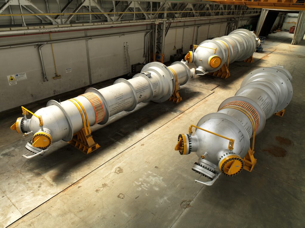 Scambiatori di calore a fascio tubiero, progettati e costruiti secondo tutte le possibili configurazioni TEMA e con chiusura Breech Lock, tubi e parti in pressione in acciaio basso legato o acciai inossidabili e leghe di Ni, Titanio, senza limiti di peso e dimensioni.
